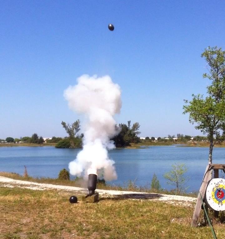ball reached an altitude of 980 feet and was doing 180 MPH on impact with the lake. After this shot we cut the powder charge in half. The ball is very visible throughout its entire flight and, because of the finger holes, it whistles as it flies. The shot always ends with a very large and quite satisfying splash. The lake is a great target. We've never missed yet. Fun Fact: Solving the equation to determine the altitude of the 500 yard shot was used as a final exam question for an advanced physics class at a major Florida university. |